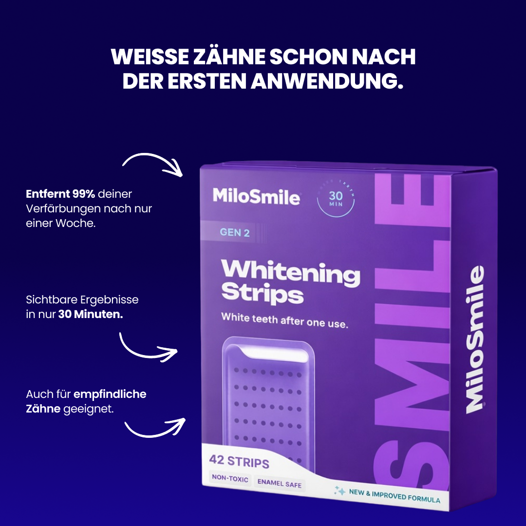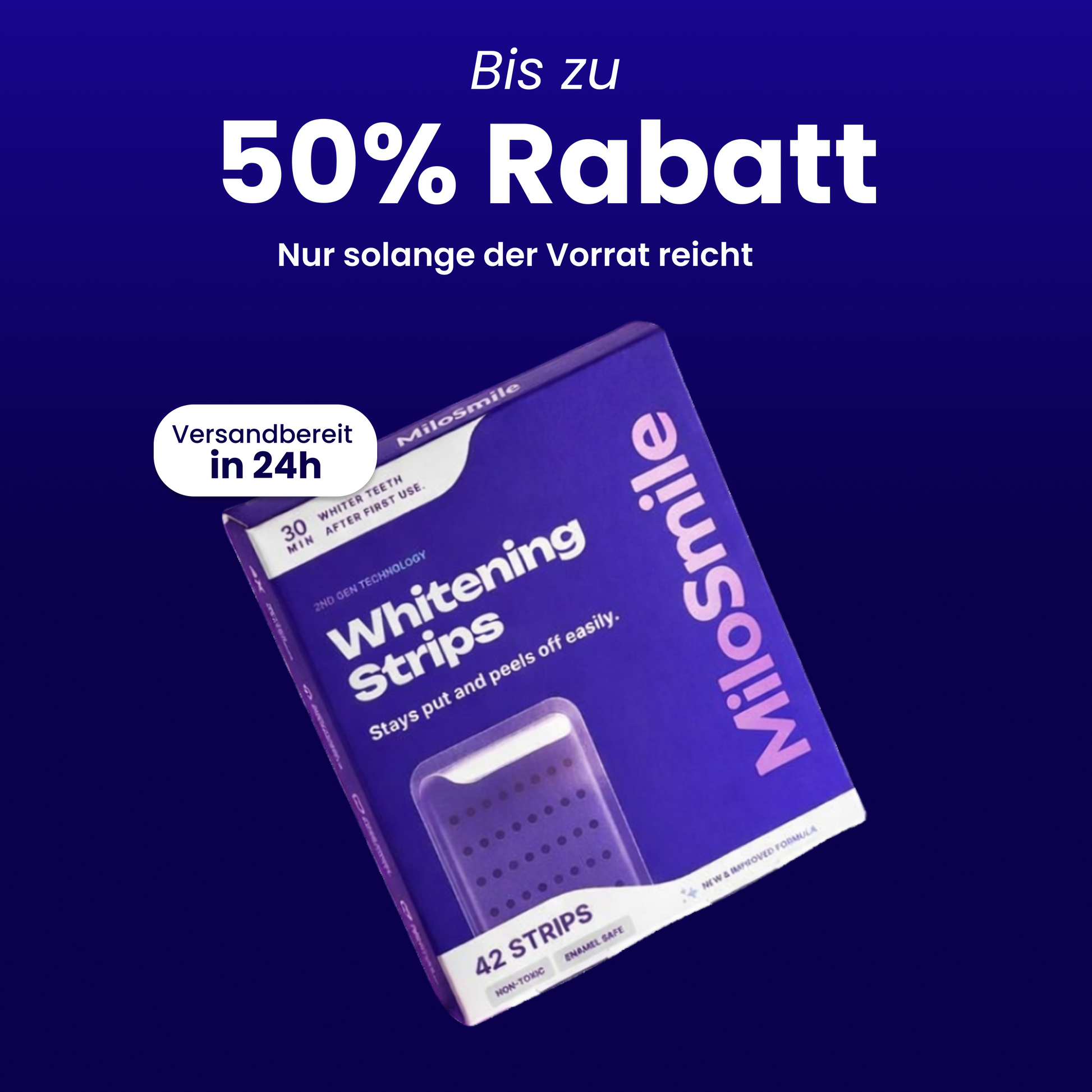 Unsere lila PureWhite Streifen kombinieren sofortige Farbkorrektur mit echter Tiefenaufhellung: Die violette Technologie neutralisiert Gelbstich direkt beim Abziehen, während die moderne PAP-Formel hartnäckige Verfärbungen von Kaffee, Tee oder Rotwein sanft löst. Das Besondere: komplett ohne Peroxid – für sichtbar weißere Zähne, ganz ohne Brennen oder Sensitivität.